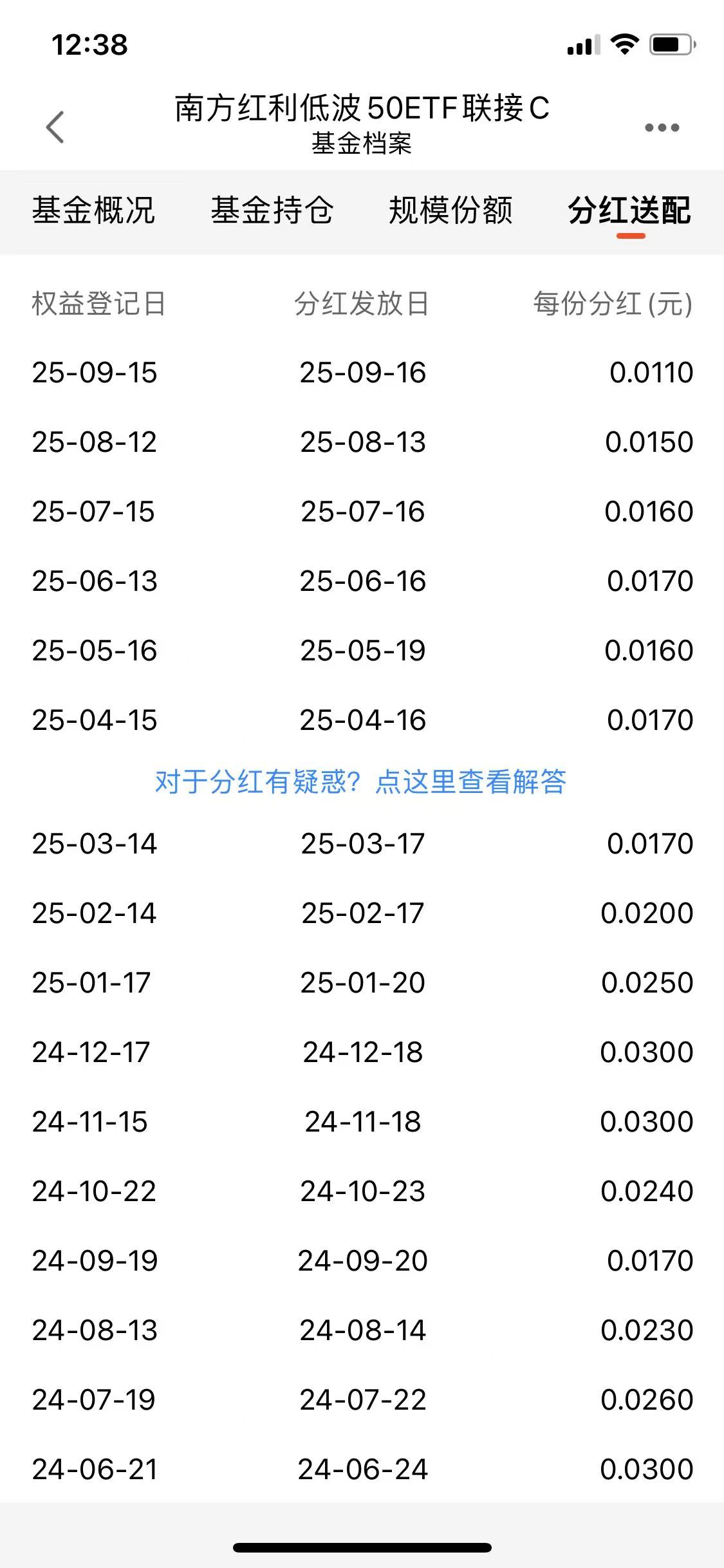 三只基金的定位不一样:一只是债基,两只是指数基金,但从分红的频率和力度来看,南方红利低波50ETF联接C显然是最亮眼的。