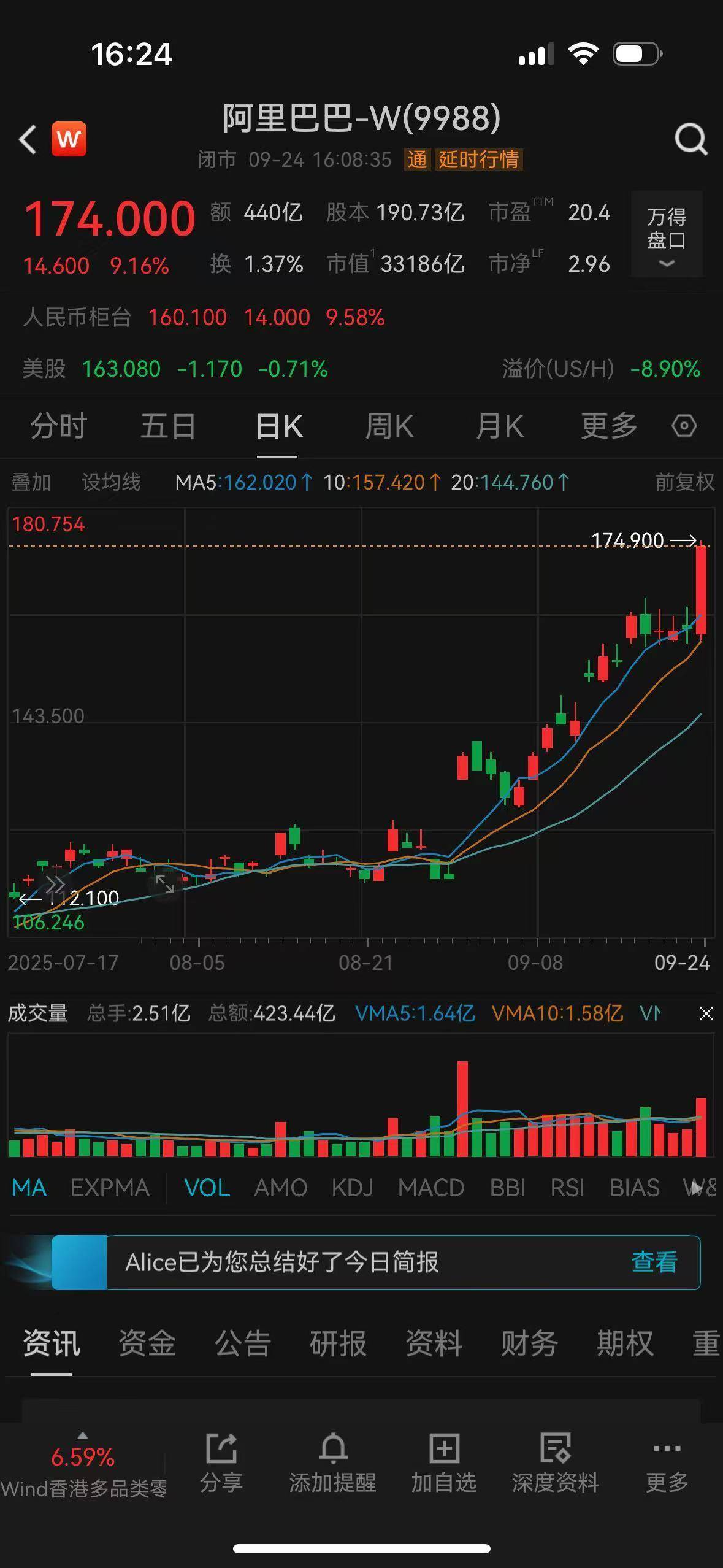 9月24日,阿里巴巴(港股迎来强势爆发,股价飙涨9.16%,收于174港元/股,创下2021年10月以来新高,总市值来到3.32万亿港元。