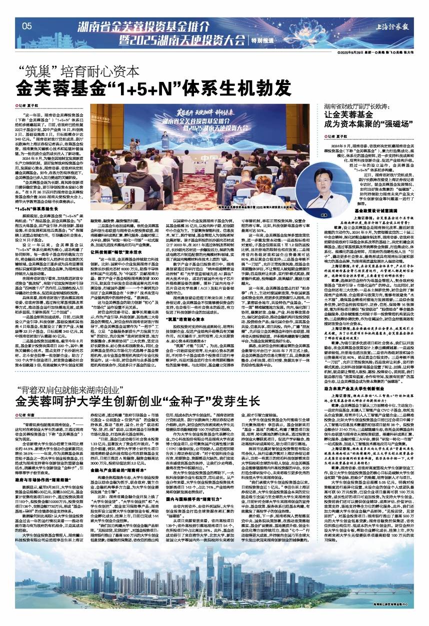 近日,湖南省财政厅党组成员、副厅长欧涛在接受上海证券报记者专访时,就金芙蓉基金发展情况、如何当好资本集聚的“强磁场”、如何持续助力湖南未来产业及大学生创新创业等问题逐一进行了解答。