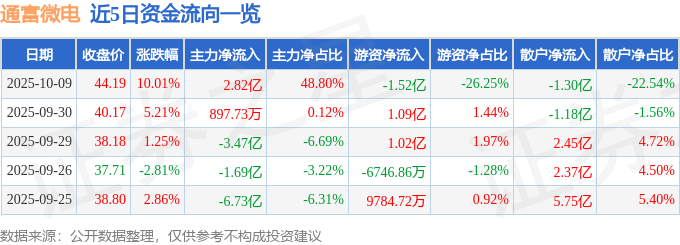 10月9日的资金流向数据方面,主力资金净流入2.82亿元,占总成交额48.8%,游资资金净流出1.52亿元,占总成交额26.25%,散户资金净流出1.3亿元,占总成交额22.54%。