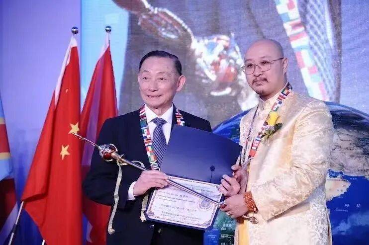 梅葆玖(中国国家一级演员、梅兰芳京剧团团长、第七至第十二届全国政协委员,国家级非物质文化遗产传承人)获颁授世界和平大使证书及荣誉权杖