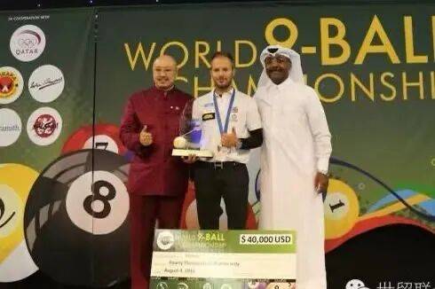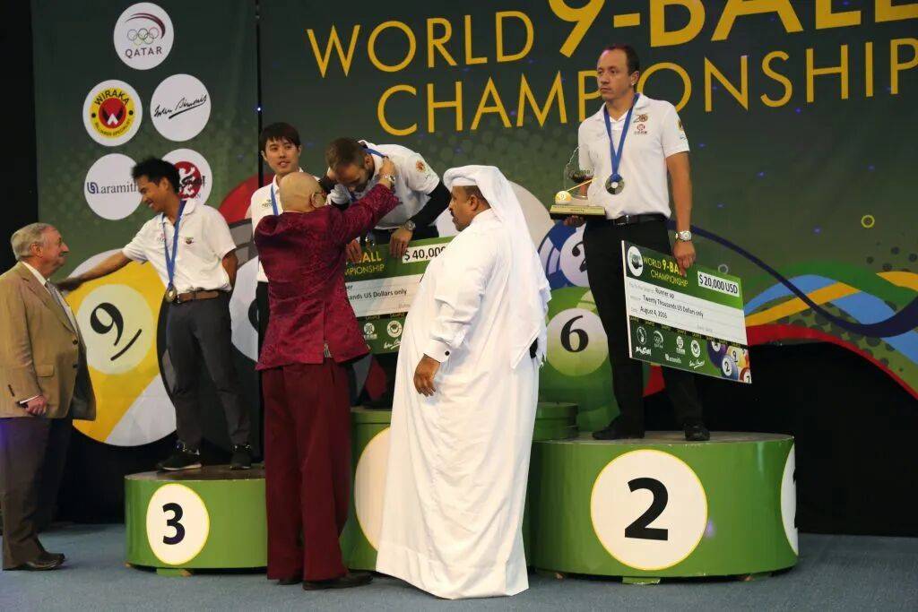 拿督斯里吴罡豪教授为2016卡塔尔世界九球锦标赛总冠军选手Albin Ouschan颁奖