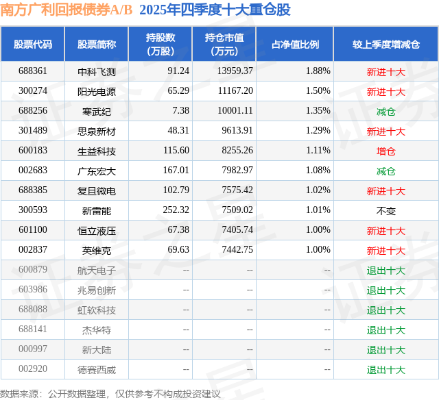 根据2025基金年报公募基金重仓股数据,重仓该股的公募基金共17家,其中持有数量最多的公募基金为南方基金的南方广利回报债券A/B。南方广利回报债券A/B目前规模为62.79亿元,最新净值1.9463(4月7日),较上一交易日上涨0.26%,近一年上涨30.93%。该公募基金现任基金经理为刘文良 王润栋。刘文良在任的基金产品包括:南方希元可转债债券A,管理时间为2018年3月14日至今,期间收益率为82.41%;南方宁利一年定开债发起式,管理时间为2020年2月14日至今,期间收益率为18.01%;南方昌元可转债债券A,管理时间为2020年3月6日至今,期间收益率为90.07%。王润栋在任的基金产品包括:南方乾利定开债,管理时间为2023年2月10日至今,期间收益率为11.2%;南方耀元债券A,管理时间为2023年2月10日至今,期间收益率为8.36%;南方晨利一年定开债券发起,管理时间为2023年3月3日至今,期间收益率为10.18%;南方骏元中短期利率债债券A,管理时间为2023年5月26日至今,期间收益率为8.07%。