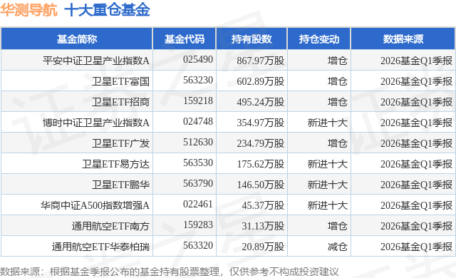根据2026基金Q1季报公募基金重仓股数据,重仓该股的公募基金共16家,其中持有数量最多的公募基金为平安基金的平安中证卫星产业指数A。平安中证卫星产业指数A目前规模为4.62亿元,最新净值1.2833(4月23日),较上一交易日下跌0.63%。该公募基金现任基金经理为翁欣 马浩然。翁欣在任的基金产品包括:港股医药ETF平安,管理时间为2023年12月15日至今,期间收益率为32.29%;平安中证港股医药ETF联接A,管理时间为2023年12月27日至今,期间收益率为39.28%;养殖ETF平安,管理时间为2023年12月27日至今,期间收益率为-3.04%;医疗创新ETF平安,管理时间为2023年12月27日至今,期间收益率为-11.39%。马浩然在任的基金产品包括:平安中证新能车ETF联接A,管理时间为2025年10月20日至今,期间收益率为17.76%;平安中证光伏产业指数A,管理时间为2025年10月20日至今,期间收益率为18.88%;平安中证汽车零部件主题ETF联接A,管理时间为2025年10月20日至今,期间收益率为3.37%;汽车零部件ETF平安,管理时间为2025年10月20日至今,期间收益率为3.8%。